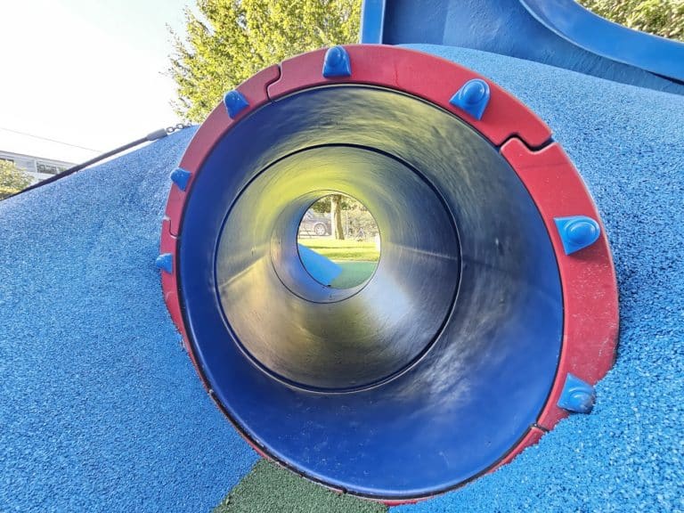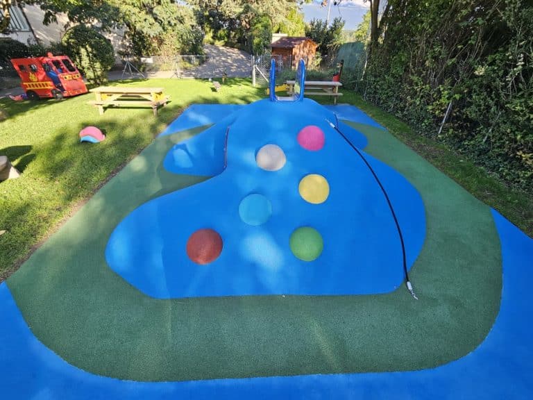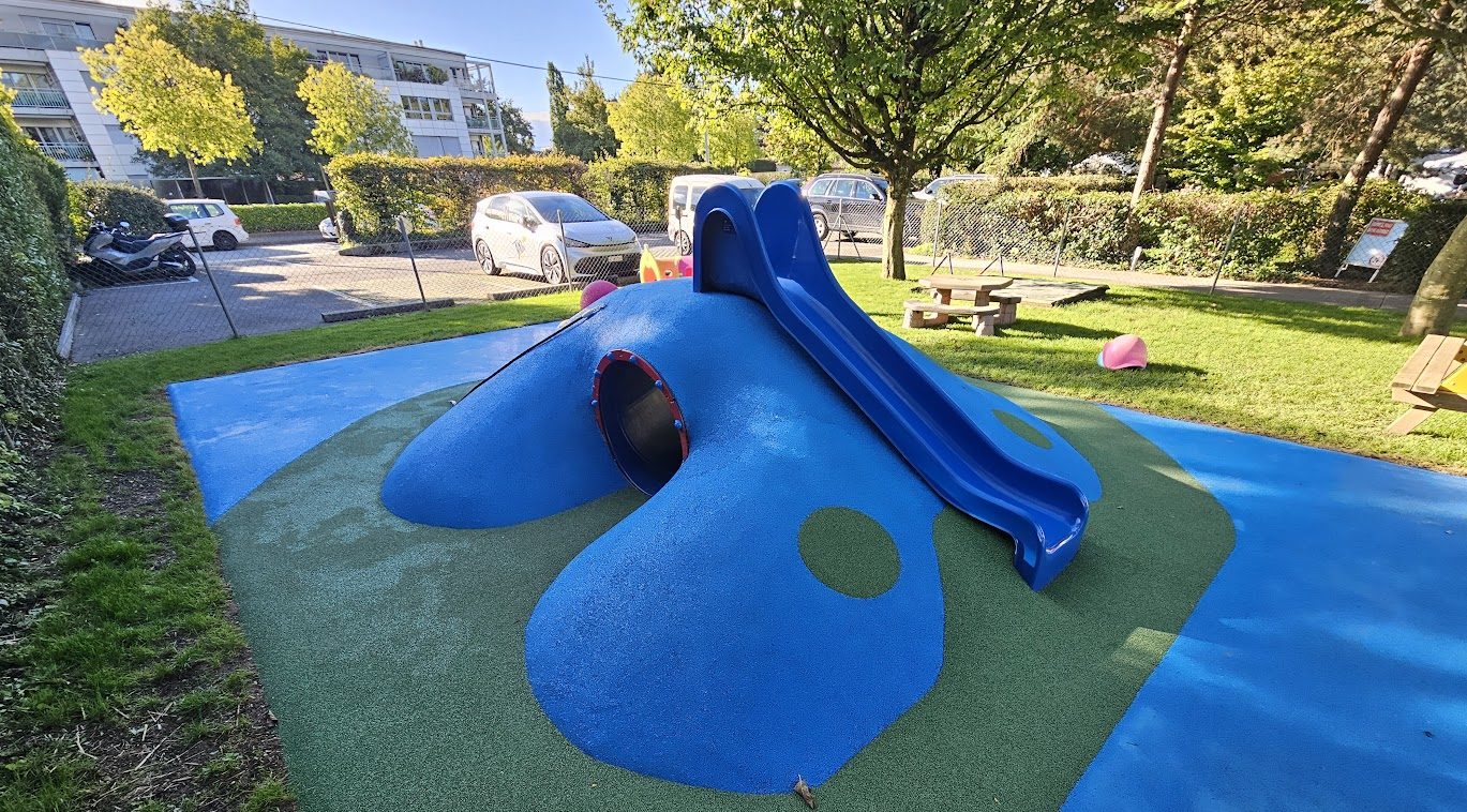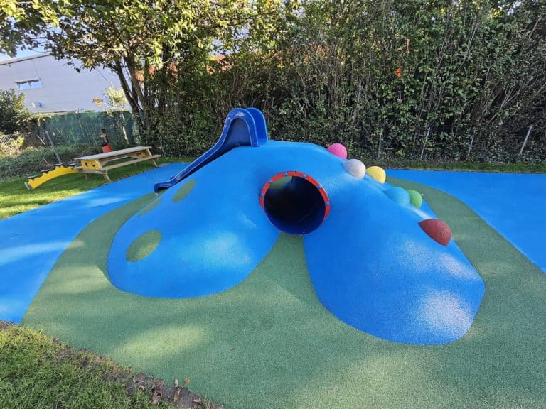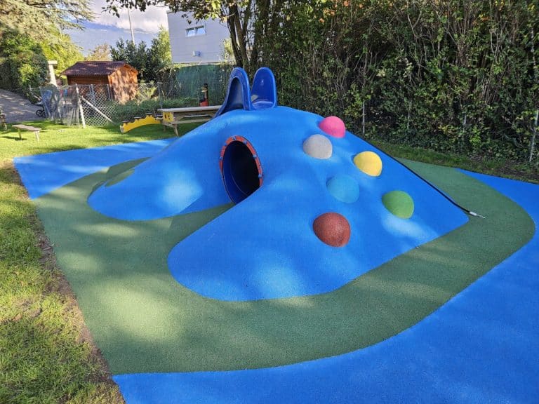 Aménagement d’une butte ludique avec toboggan et tunnel intégrés.